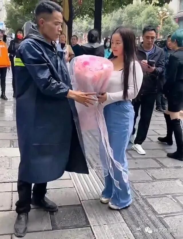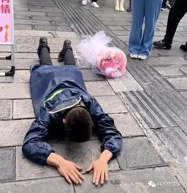 视频发布后的第三天,男子果然拿着一块牌子走上街头,上面印有所谓表姐的照片,手拿一束鲜花,就开启了她三跪九叩的求婚之旅。