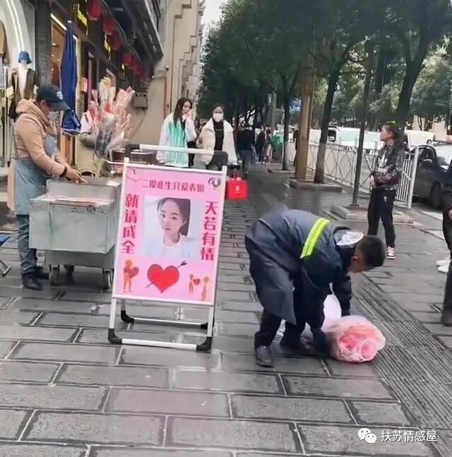 根据视频画面显示,男子左手捧着一束鲜花,右手拿着一块牌子,上面写着二傻此生只爱表姐,天若有情,就请成全的字样!
