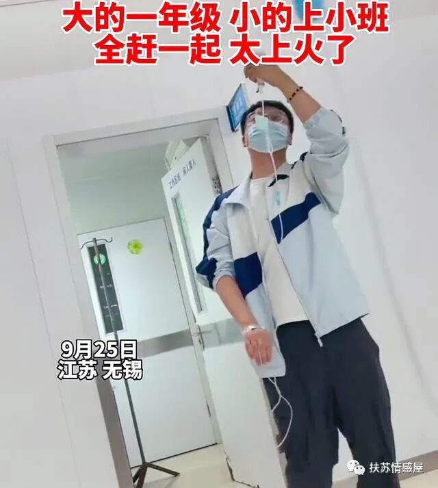 近日,江苏无锡,有一对年轻夫妻因为辅导孩子作业太上火,结果双方住进了医院,两人坐一起输液,形成了一条美丽的风景线!