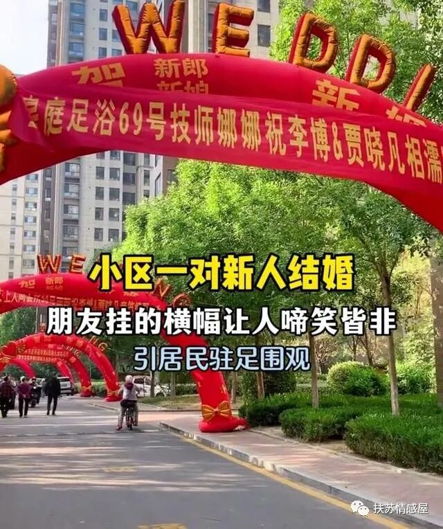 据视频拍摄者介绍,横幅和拱门做好了以后,小区的人就开始议论了,有人说这个新郎有故事,也有人说这些朋友很过分,这样做就是在拆台。