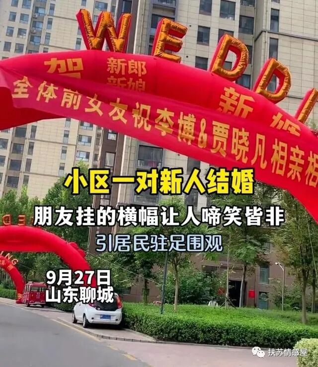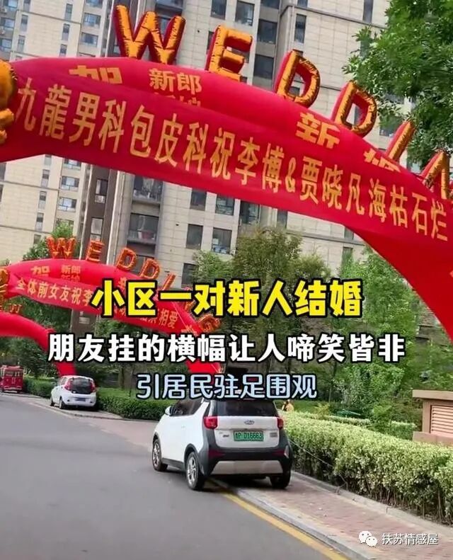 山东:男子结婚,朋友们送的横幅标语让人啼笑皆非,引发社区居民驻足围观