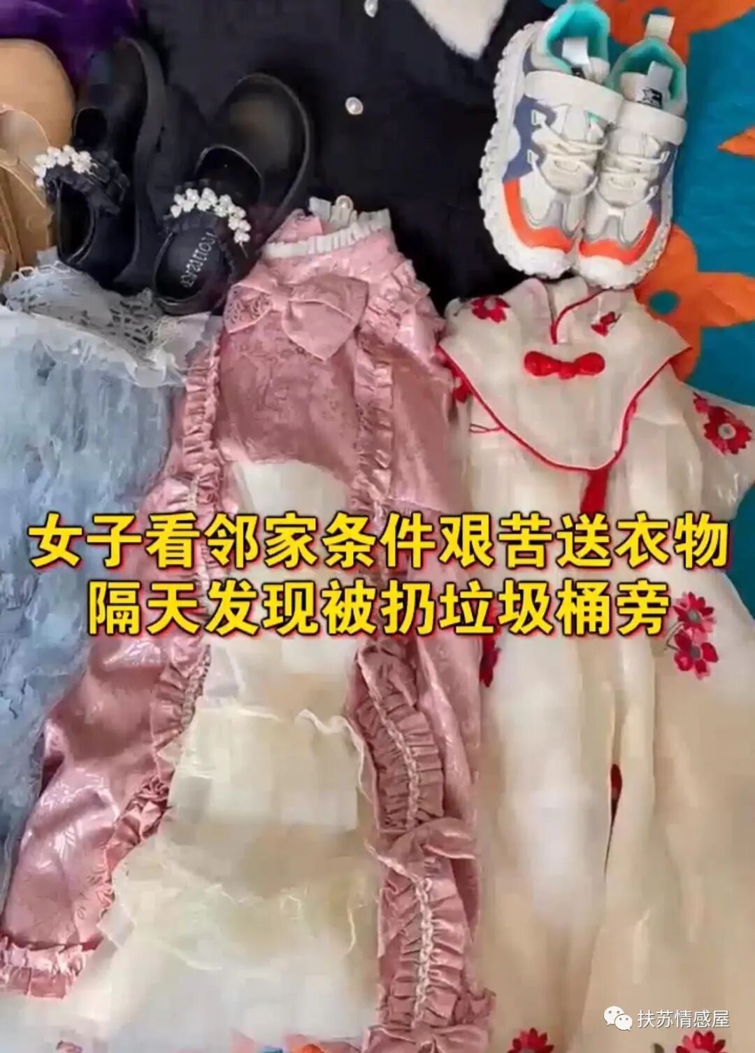 女子表示双方认识三四年了,两家人关系也还可以,主要是看他们家的两个女儿比较可怜,才会想着把女儿没穿过的新衣服给他们家。女子给衣服时邻居高高兴兴收下,没想到后来对方会这样,女子觉得善意被羞辱,气不过才拍视频诉苦,没想到会在网络引起轩然大波!从客观的角度而言,女子的做法也没啥大问题,但她似乎忽略了一个重要的问题,那就是事先询问别人,直接给别人并没有拒绝的机会!有些人自尊心比较强,女子送衣服虽然是好心,但却在无形之中伤害了别人,别说外人,哪怕是兄弟姐妹,都会产生不必要的误会!