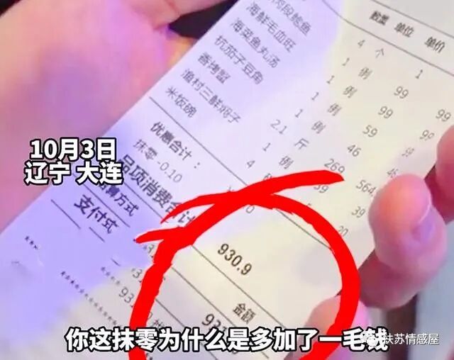 近日,辽宁大连,有一名男子带着朋友去餐厅吃饭,他们合计消费了930.9元,却被收取931元,询问店员原因反遭怼,问他是不是缺一毛钱,可以私下转他一毛钱。