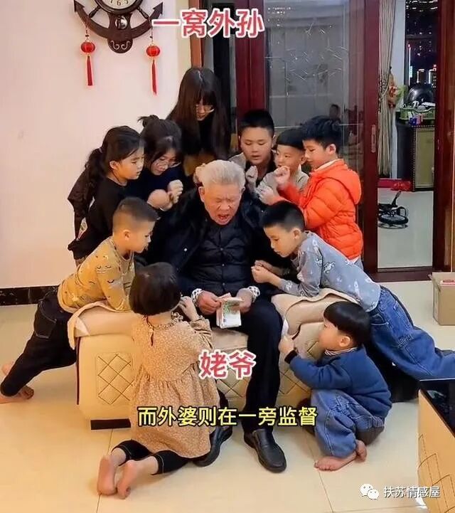 老人的外孙之中,最大的一个已经上大学,最小的还在上幼儿园,两个儿子的孩子还没带回来,要不然就得十三个孙子一起带!