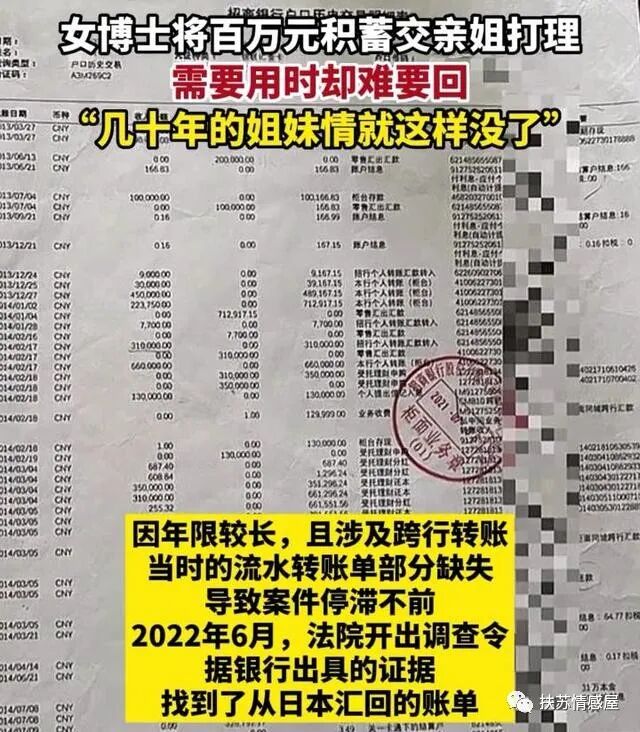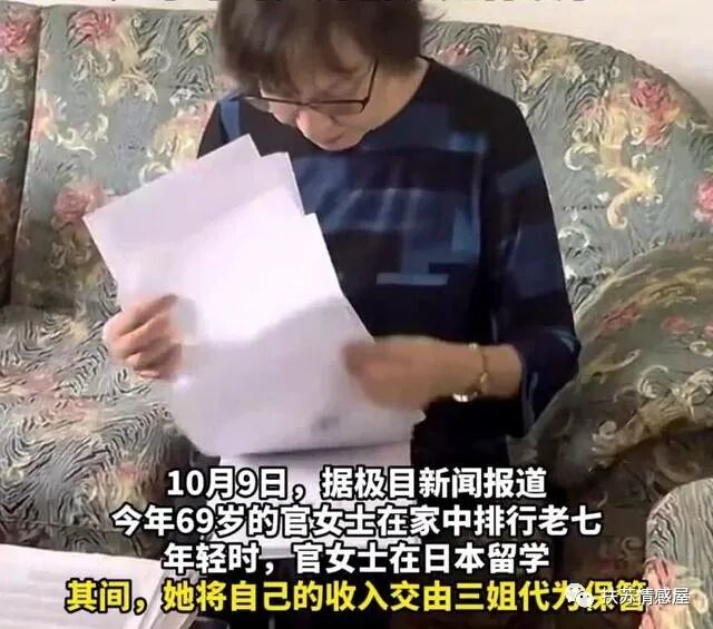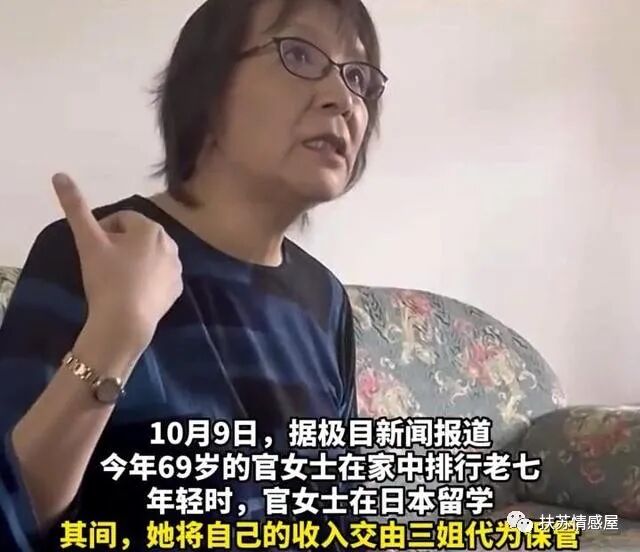 据悉,官女士今年69岁,曾在日本留学博士,毕业后就留在日本工作,赚的钱全数寄回国内给姐姐打理,其中一部分用于给母亲养老!