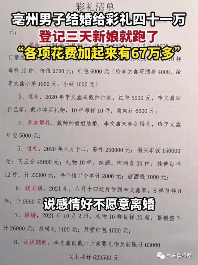 近日,安徽亳州,有一名男子花费60多万娶老婆,结婚登记才三天老婆就跑了,起诉离婚讨回,对方却说感情好不愿意离婚!