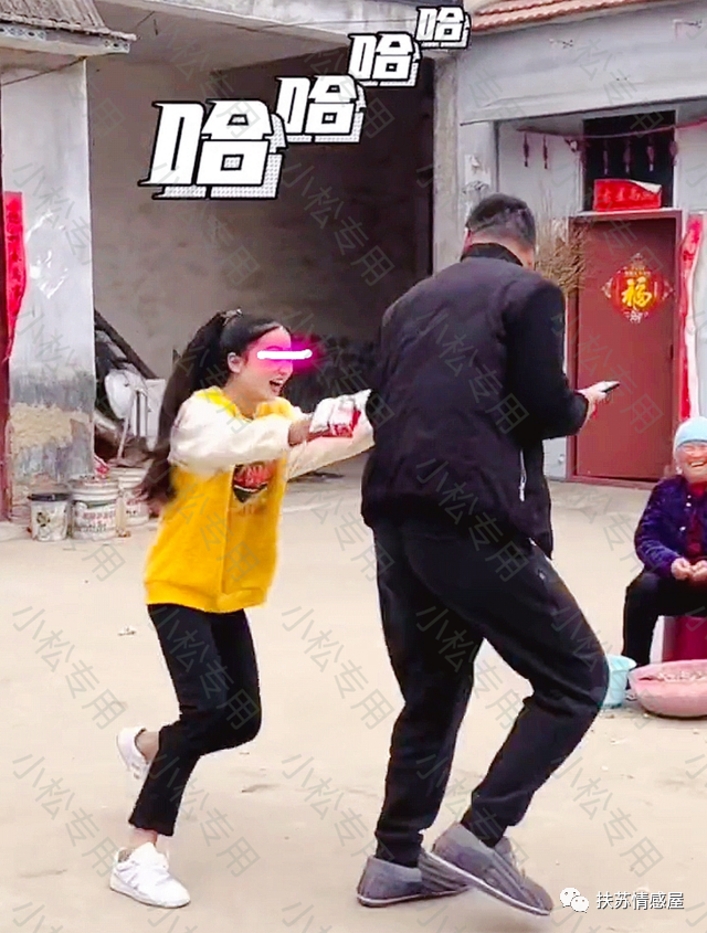 公公看到儿媳冲过来,一把将他拽住被吓得不知所措,公公下意识地忍不住不断后退,公公和媳妇打闹的样子像极了一对父女。