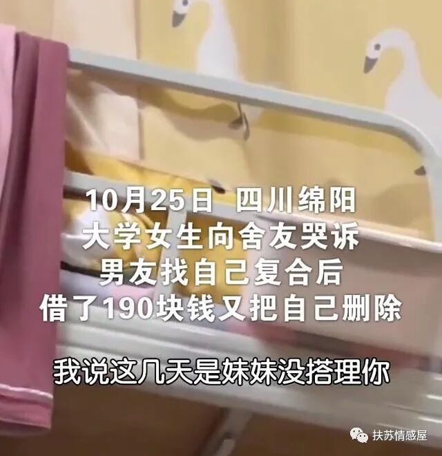四川的一所校园内,有一名女生跟舍友哭诉,男友又死乞白赖求复合,女生终于心软答应,没想到对方骗了190元又将她拉黑!