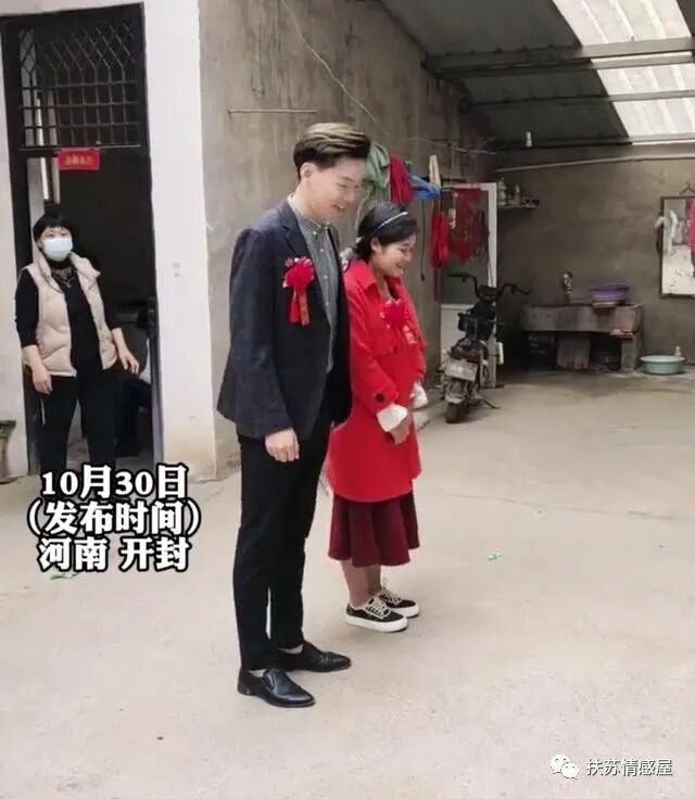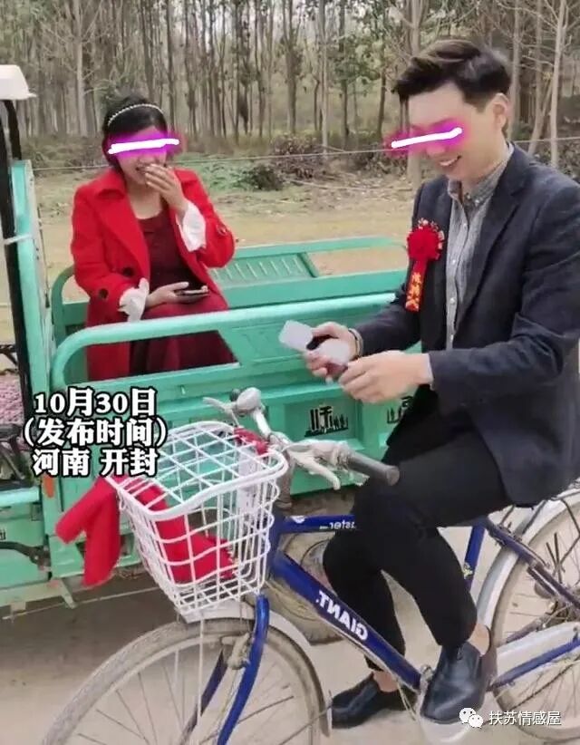 尽管没有婚车,唯有一辆破破烂烂的自行车,新郎和新娘的脸上还是充满了该有的幸福,很显然这一切都是他们两个人商量好了的!