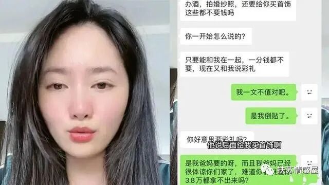 尽管男友说话很过分,女生也没有想就此放弃,说出父母的想法,让男友家给3.8万彩礼,我们先把婚结了,男友却说我们家真拿不出这些钱!