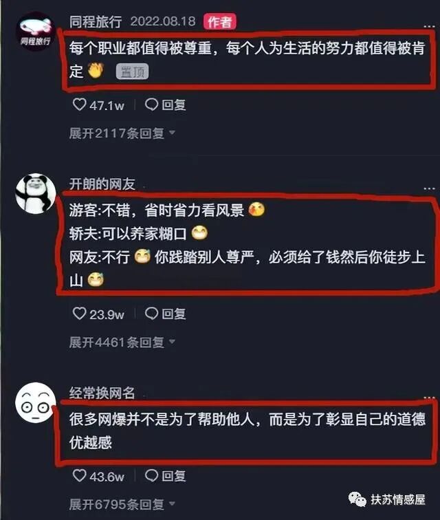 部分人认为,空手爬山都已经很辛苦了,作为一个年轻人,花点钱让跟自己父亲年纪差不多的大叔把自己抬上山,就是一种无耻的行为,一点也不懂得体谅民工的辛苦!