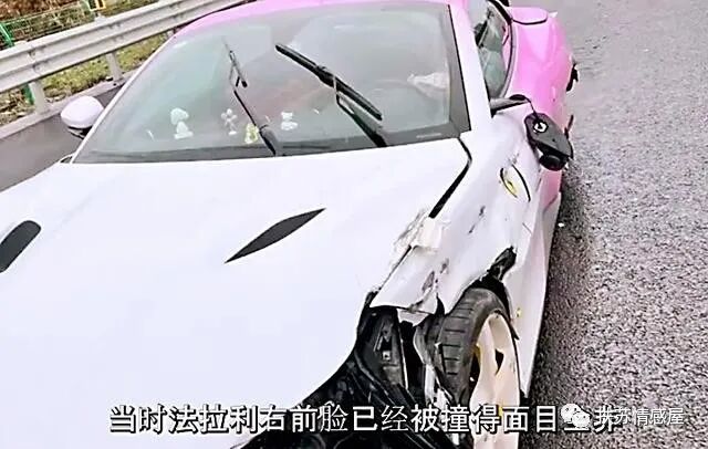 由于路面比较湿滑,后来车轮出现打滑现象,吴女士极力纠正方向盘,最终撞到了路边的护栏,百万法拉利也被直接撞变形!