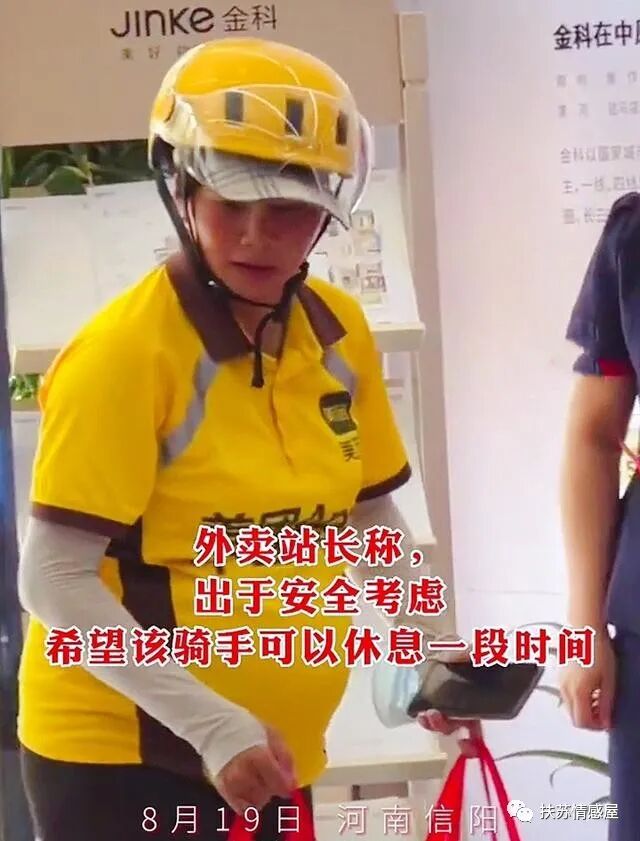 女骑手却说自己闲不住,不愿意在家里休息,还不如出来工作,给孩子多挣一点奶粉钱,以后孩子出生了也不会那么窘迫。