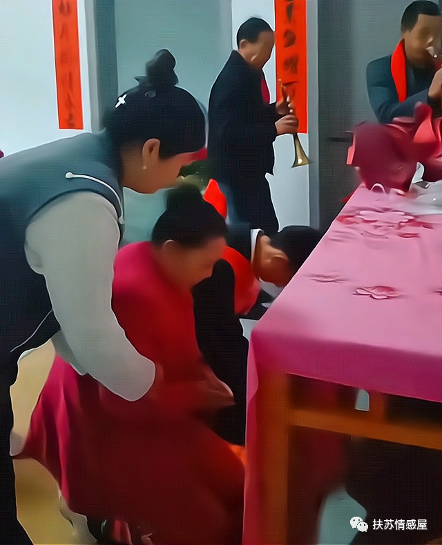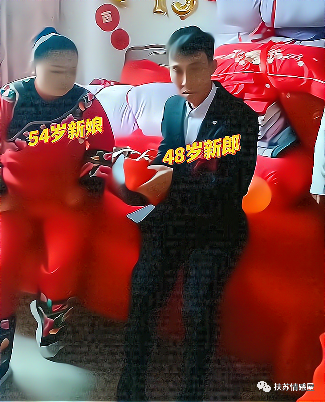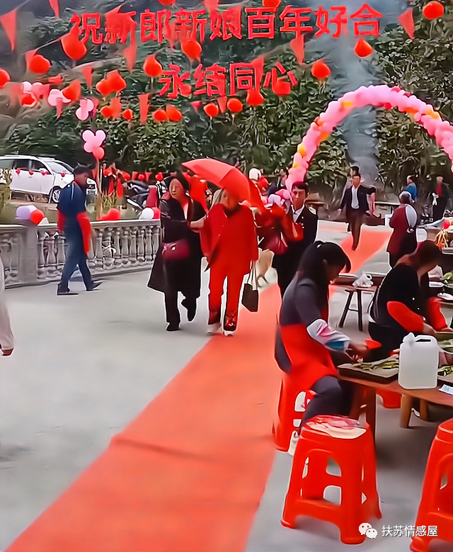 据悉,新郎和新娘两个人加起来都100多岁了,男人至今未婚,女人已经是二婚还有两个孩子,男人还是愿意风风光光地将她娶进门!