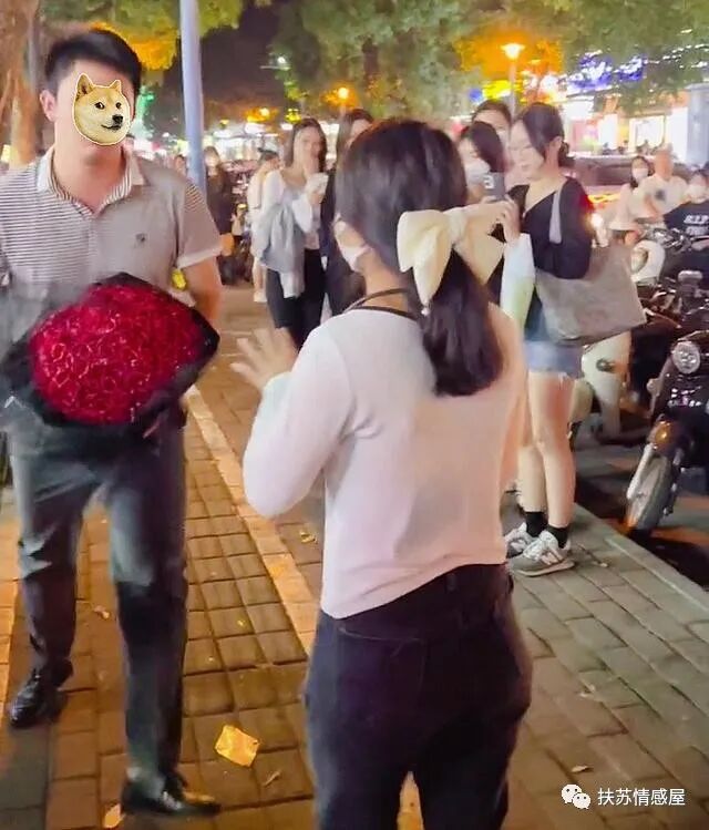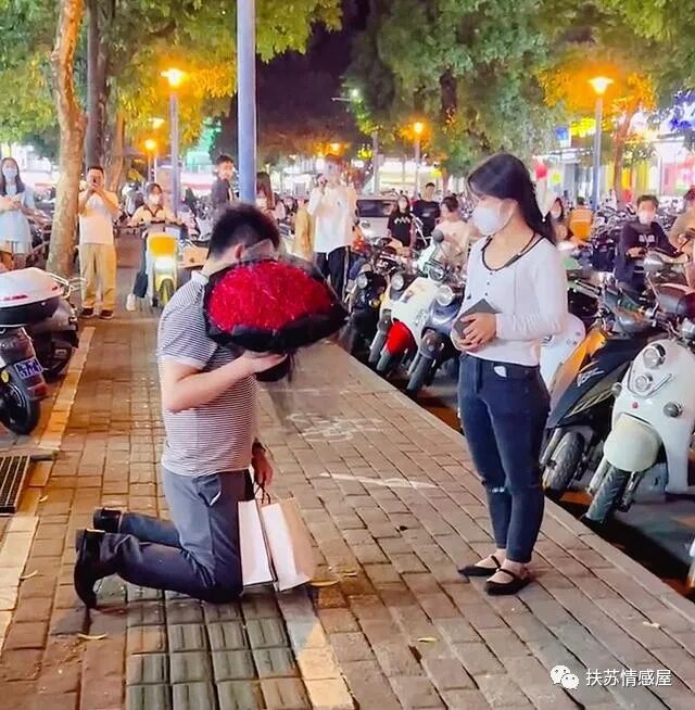 事件发生在傍晚时分,街道上正是人来人往的时候,男子手捧鲜花将心仪的女孩约了过来,随即就开始上演跪地求婚的戏码!