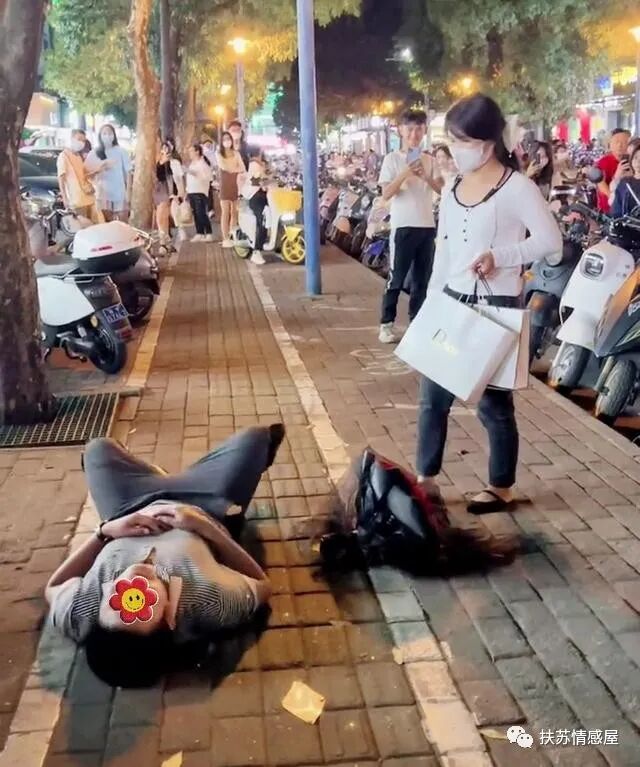 女生无奈只能将他搀扶起来,但男人却不愿意,反而顺势躺在地上,撒泼打滚说女生不珍惜他!