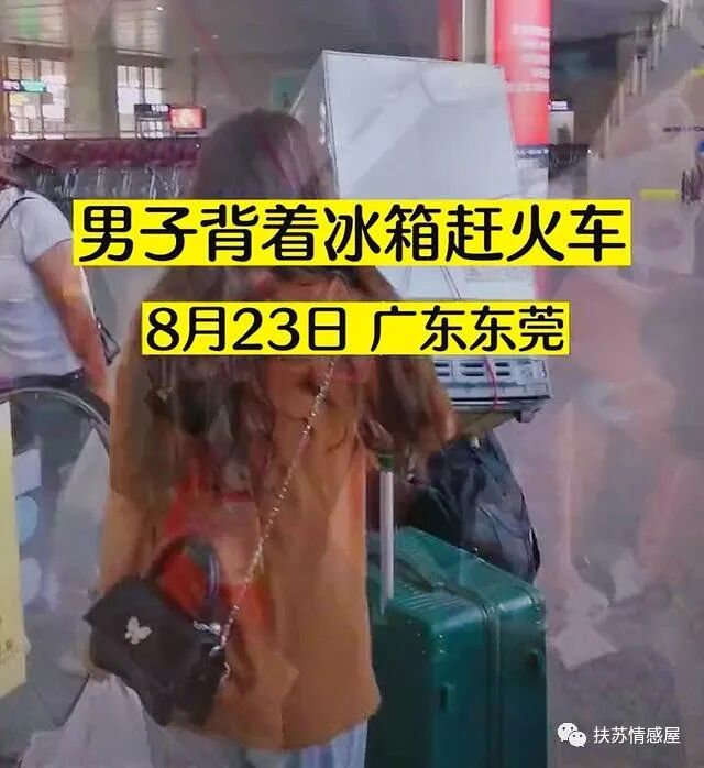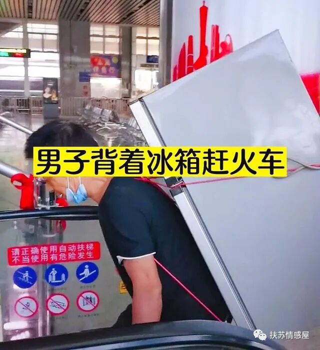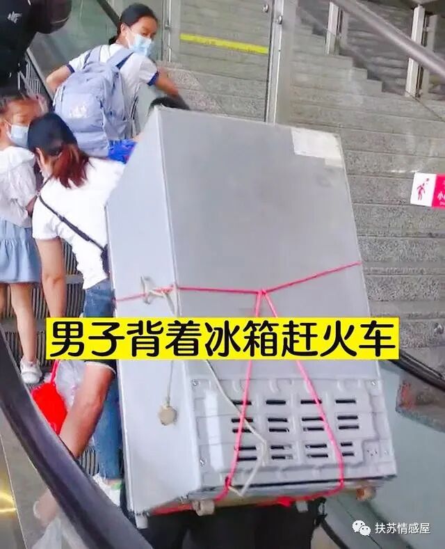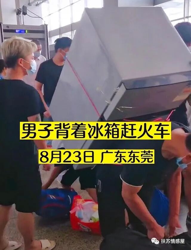 近日,广东东莞,火车站内出现了一名特殊的乘客,他准备背着冰箱坐火车回家,走到安检门口时,放下来就没法放到肩上了。