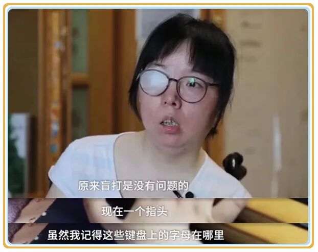 本来盲打没问题的王磊,受病魔的阻碍,即便她记得键盘上字母的位置,也只能耐着心性用一个手指,一点一点地完成。