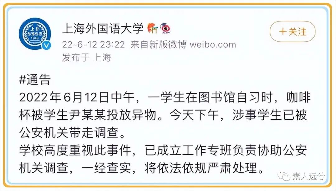 上海外国语大学发布通告,这名男生已经被公安机关带走调查。