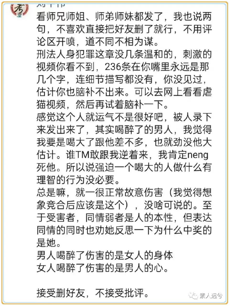 还有西南政法那个学生,虽然他没犯罪,但他的言论真的让人不寒而栗,这样的人如果进入司法系统,他能匡扶正义吗?他能为人民服务吗?