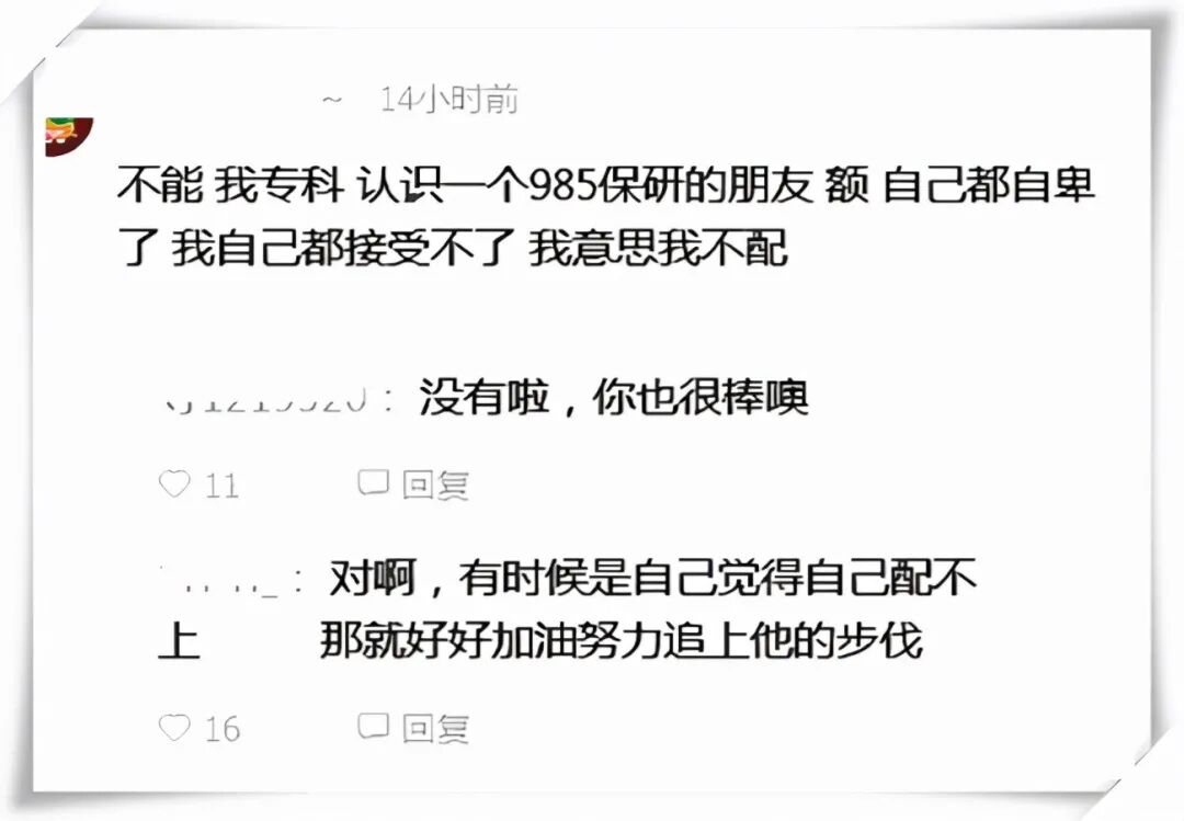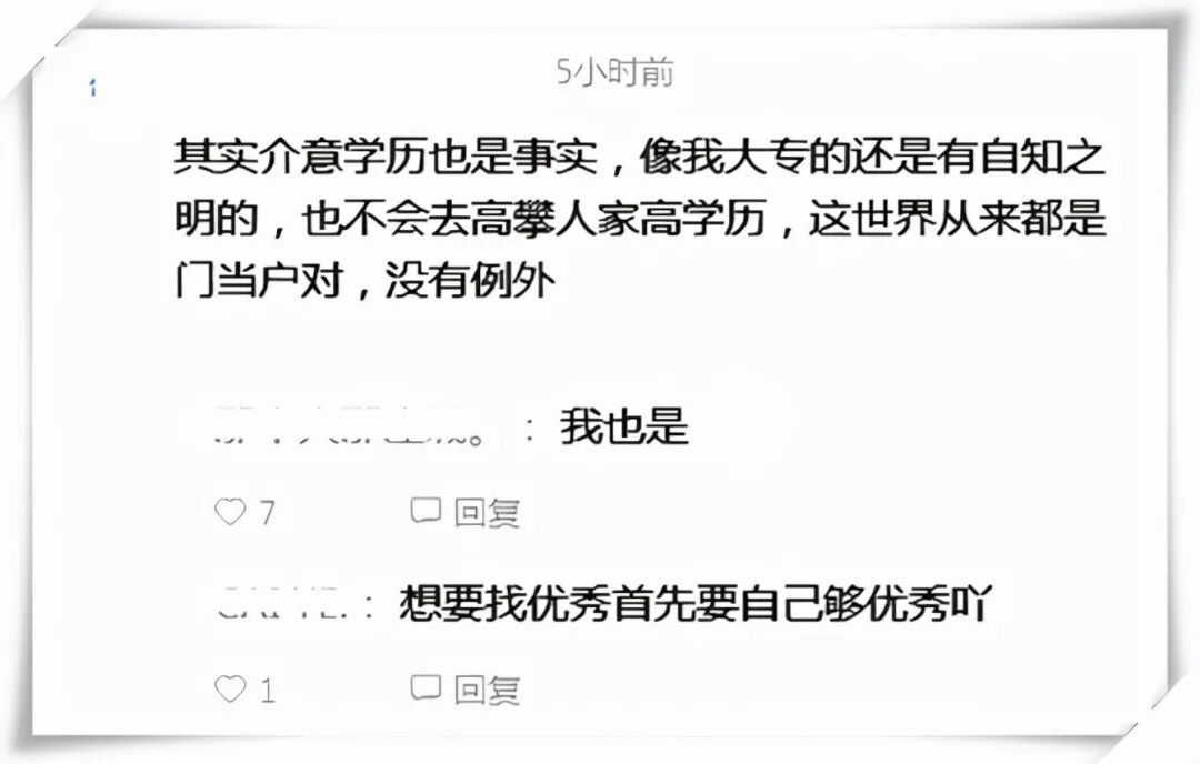 有一位网友说,谁都逃不出“门当户对”的世界,我自己是专科学历,也不会去高攀人家高学历的人。