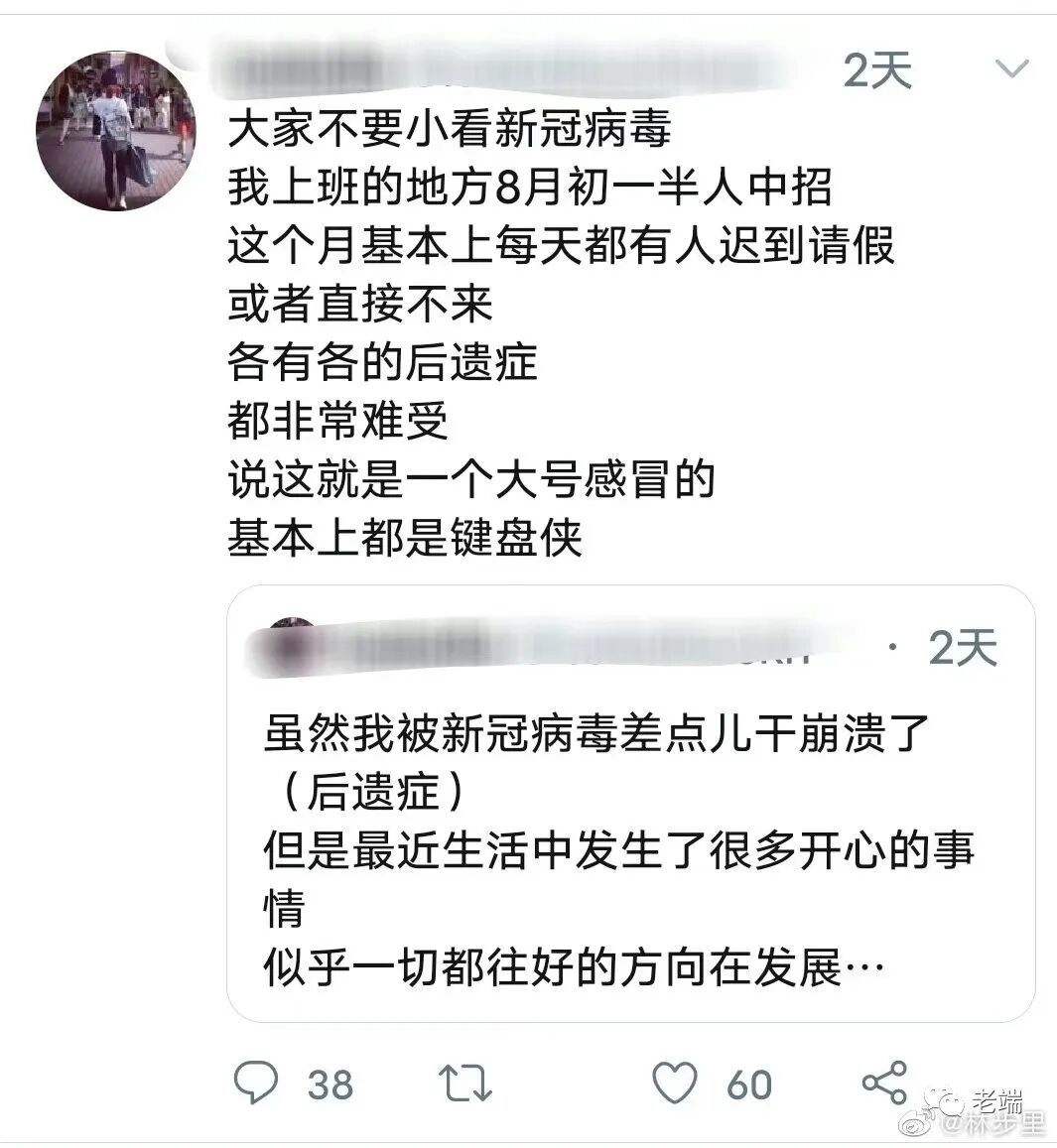 长期新冠患者,痛不欲生地躺在家里,他/她会让你看到吗?他/她还有力气去旅游逛商场吗?他还能正常去上班吗?你没看到不代表不存在。