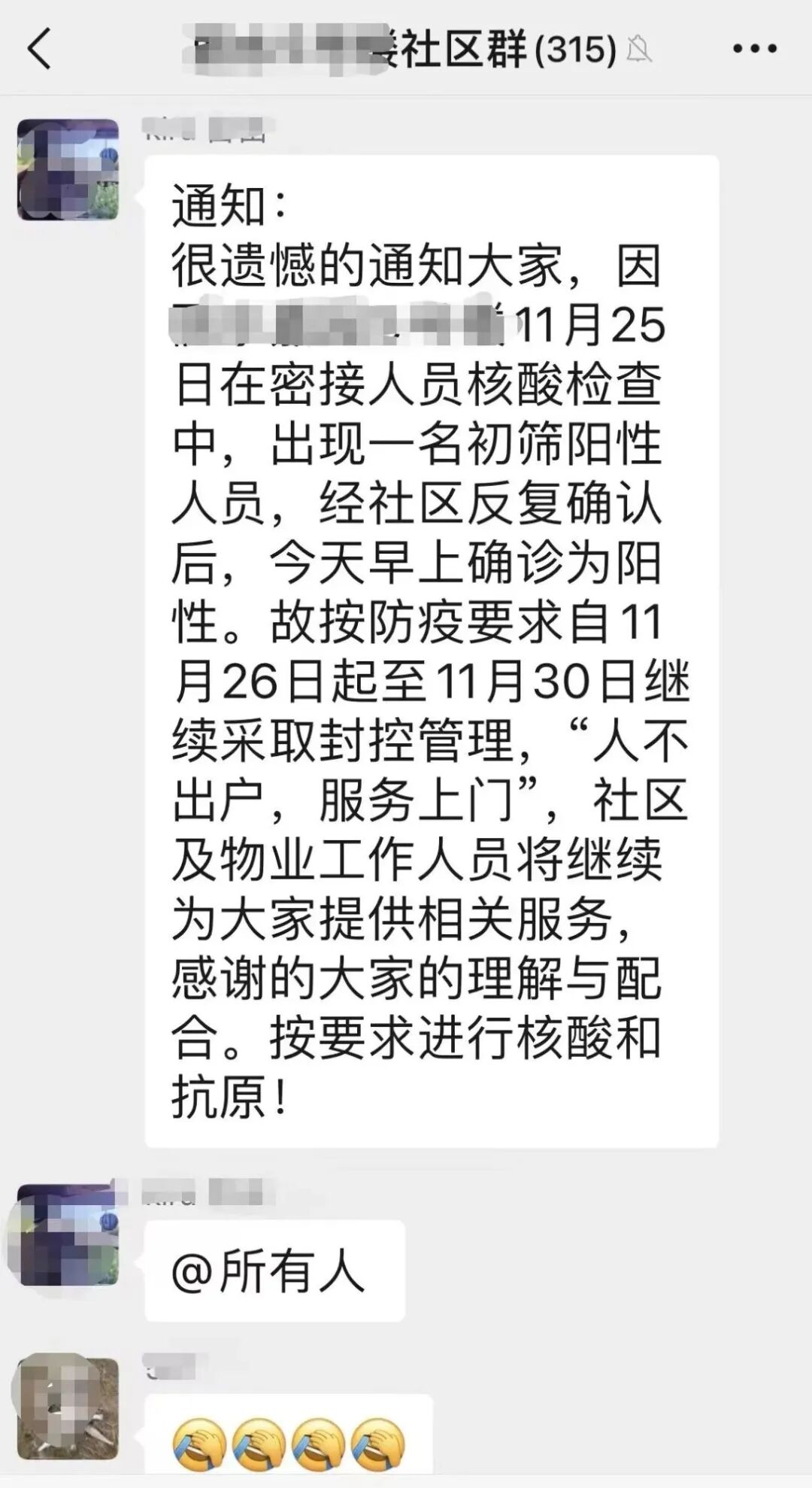 可是在周六社区又发了通知,说新出现一个阳性,所以要再续封五天至11月30日。于是,社区群里炸了锅。我们就怕续了又续,没完没了。有的地方,说是五天七天,最后封了几十天,可谓是前车之鉴。