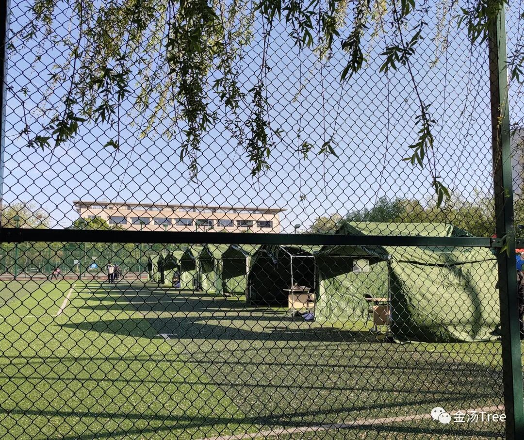 4.30号周六,我第一次走进小区安置在篮球场上的核酸检测点,被眼前整齐排列的棕色长椅、红色亭子和绿色帐篷惊艳了。再加上蓝天白云,阳光斜射,这幅场景真壮观、真和谐、真美好!让我觉得既像是欢欣鼓舞的亚运会场,又像是严肃有序的青春军营。