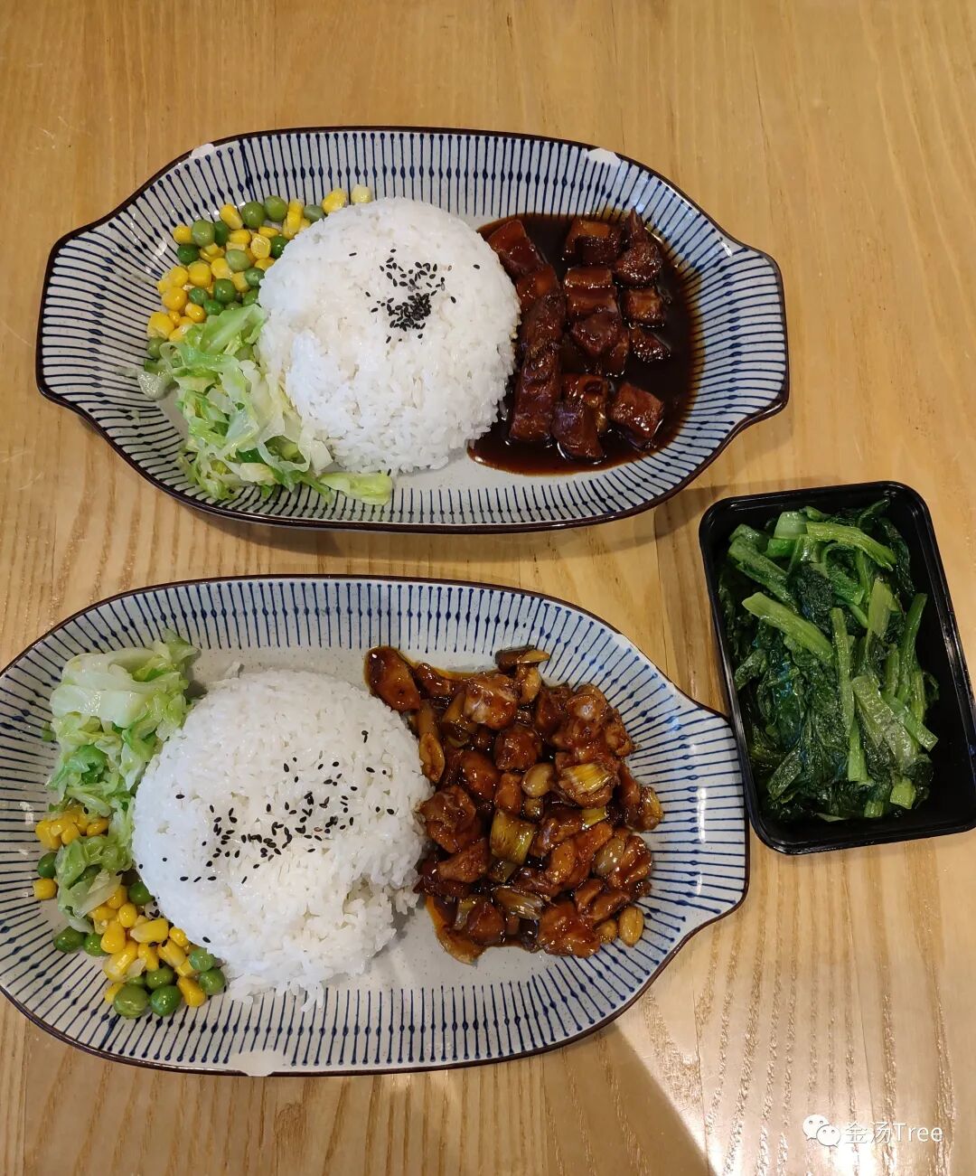 比如他家的盖饭基本都是长这样的:长方形的盘子,中间一份米饭,米饭上有几粒黑芝麻;一端是“标配”地玉米和青豆+白菜丝,另一端是你点的“主菜”,比如宫保鸡丁、梅菜扣肉或者红烧肉等。