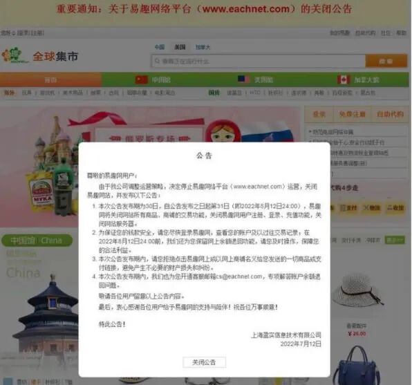 在2022年8月12日24:00前,易趣网将关闭网站所有商品、商铺的交易功能,同时关闭易趣网用户注册、登录、充值功能,关闭网站服务器。