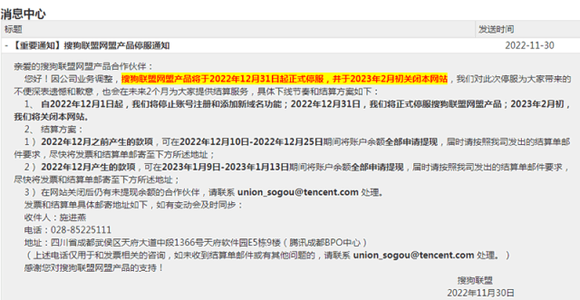 而搜狗联盟往往是以“备胎”身份出现,当站长的百度、adsense帐号被封了之后,他们才会选择用搜狗联盟。所以这么多年,搜狗联盟的存在感一直很低。再加上年夏季,腾讯方面以35亿元人民币收购搜狗后,搜狗很多产品都逐渐关闭了,搜狗联盟没必要和腾讯广点通同时存在。随着腾讯对搜狗资源的整合,未来关停的搜狗产品大概率将会越来越多。
