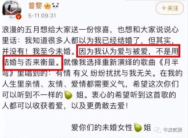 当年,很多人说她已经结婚了,但她立马发了一篇小作文,澄清自己目前仍是单身,并且她还称爱与不爱,不是用结婚与否来衡量的。
