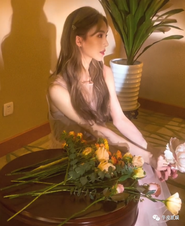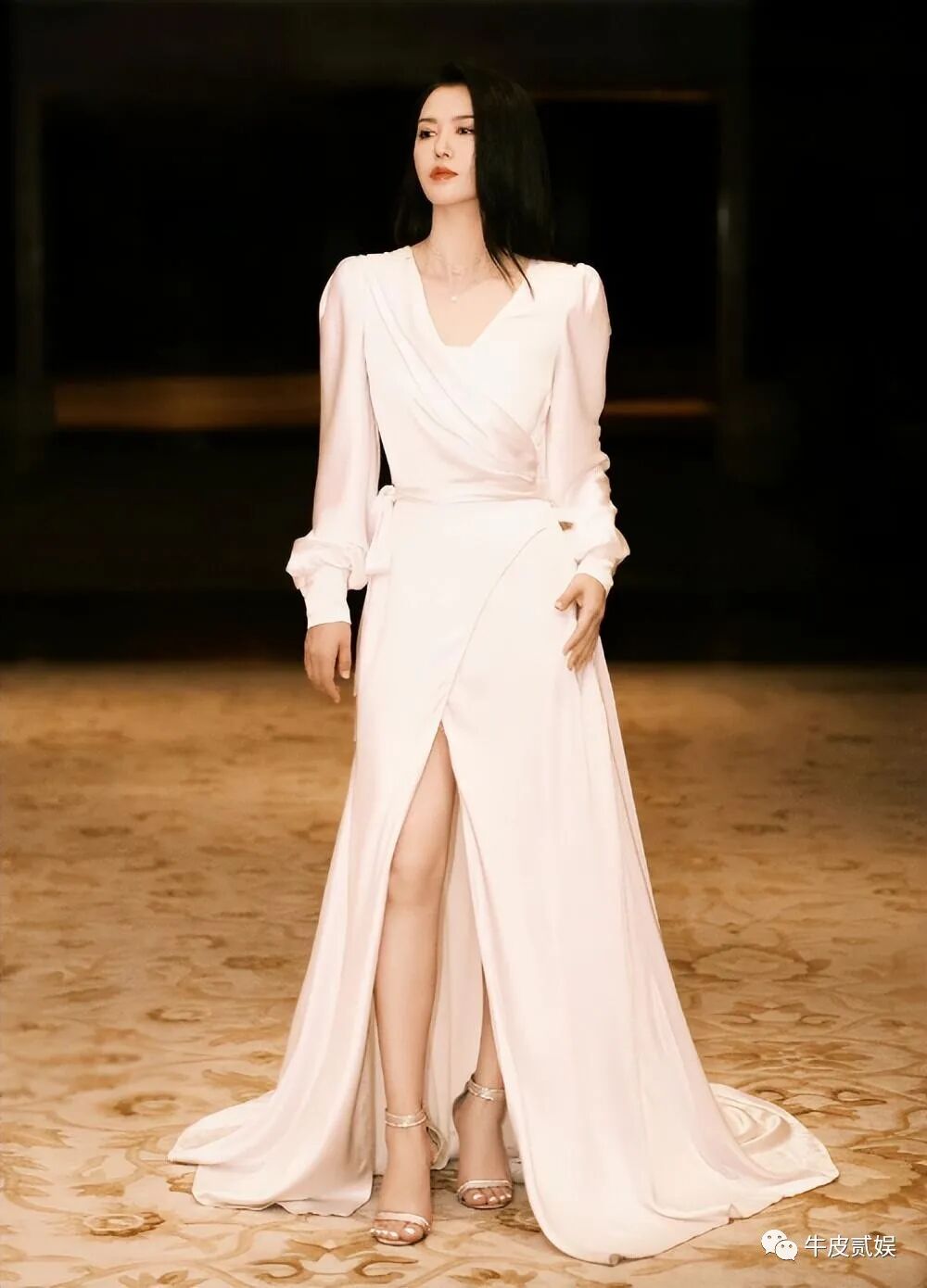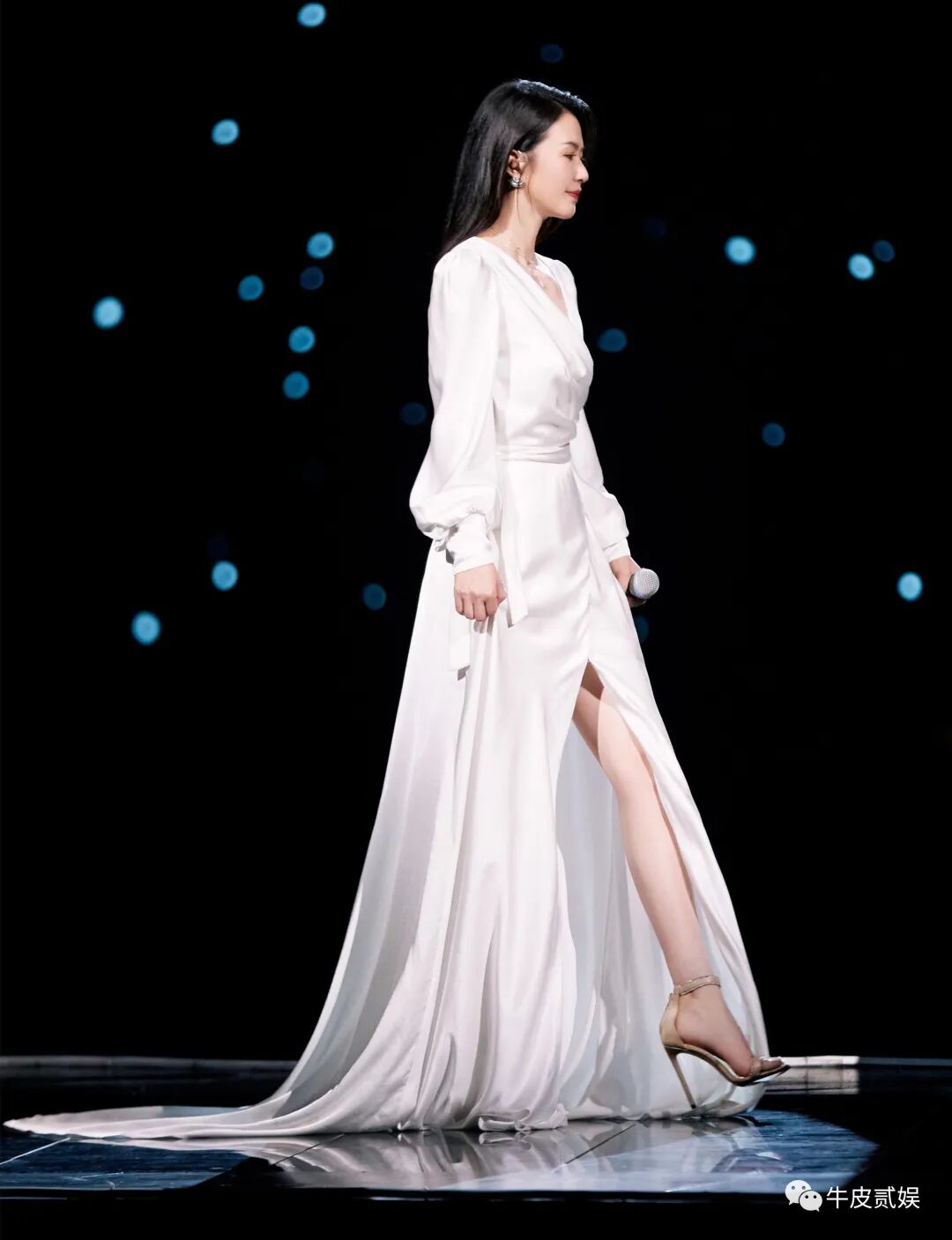 这次她选择了一身丝质长裙,看起来既有睡裙的垂感和性感,又有礼服的华贵和清雅。