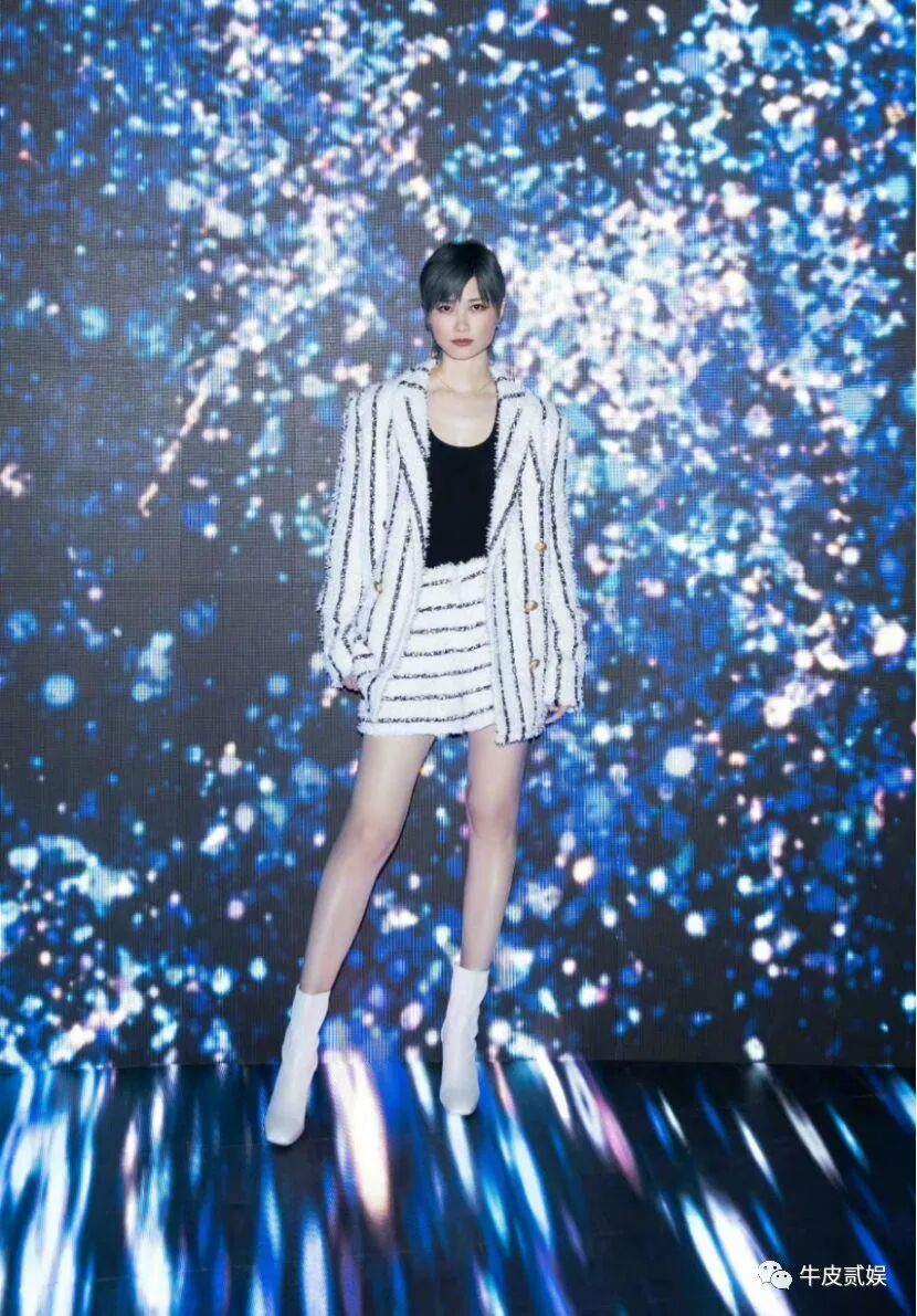而她当晚选择了绒面白黑白条纹套装,展露出一双大长腿,尽显干练利落的魅力风采。