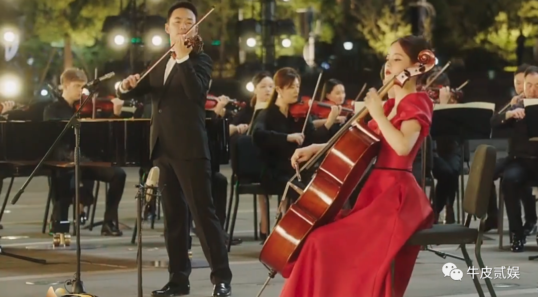 礼裙有垫肩设计,演奏的时候,一身红裙的欧阳娜娜,在一众黑色的乐师里显得尤为出众。
