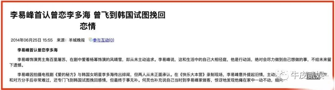 2012年,李易峰出演电视剧《爱的密方》,而和他对戏的是韩国美女李多海,两人因戏生情,从戏内爱到戏外。