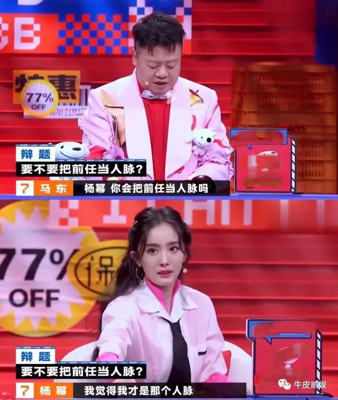 比如,在综艺节目《奇葩说》中,主持人马东问她:“杨幂,你会把前任当人脉吗?”