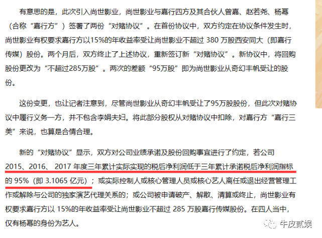 所以此时的她,顺应圈子里的玩法,搞了个“对赌协议”,拿到了尚世影业的3亿投资,但杨幂需要承诺三年之间完成3.1亿的净利润。