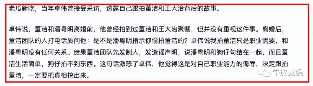 可董洁的团队在得知这件事之后,却找上了卓伟,质问他是不是被潘粤明收买,还称“狗仔拍不到东西”,于是这才激怒了卓伟,据说最终两个记者一个踩在另一个人的肩上,这才拍到了身处9楼的董洁与王大治,而这条新闻也彻底揭露了董洁的真面目,为潘粤明洗脱了冤屈。