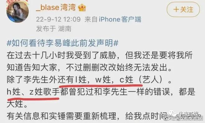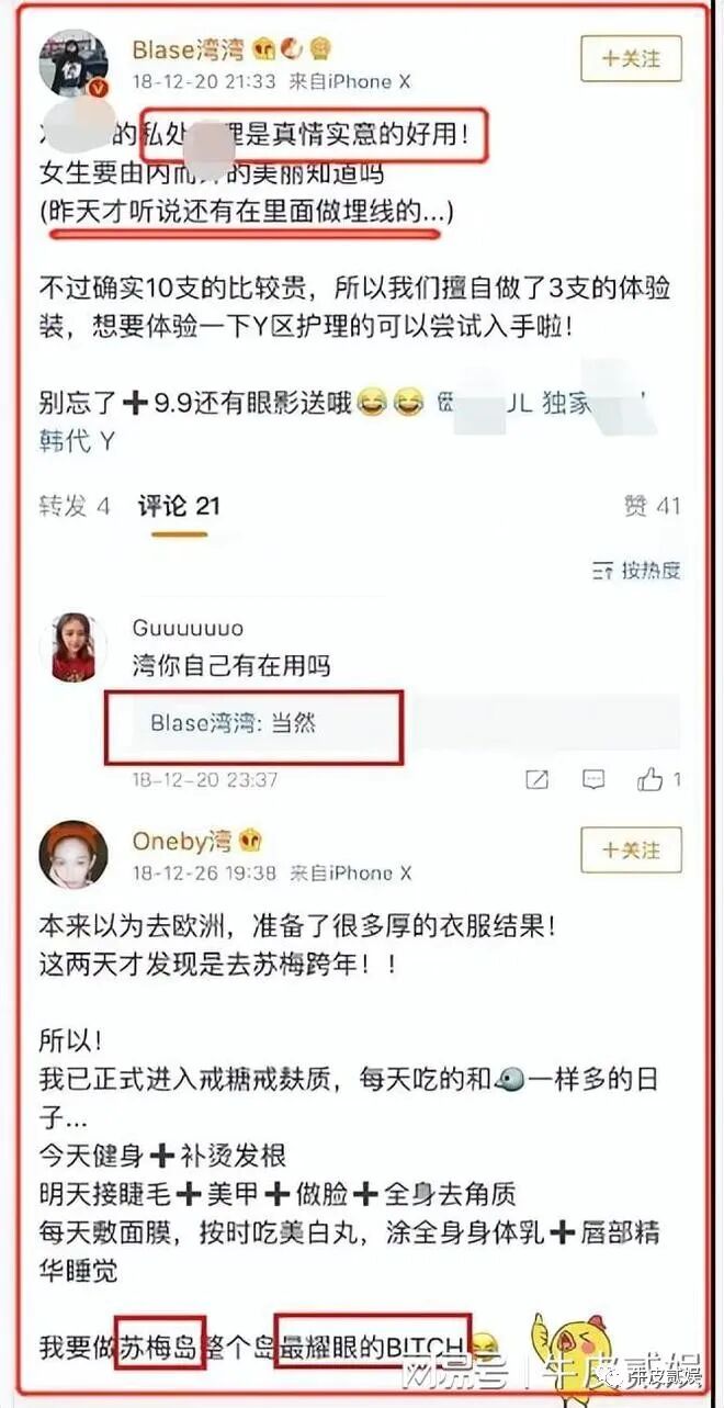 不敢想啊!网红湾湾在圈里接待过的“课人”,可不仅仅是李易峰一个人啊,还有她主动爆出来的l姓,c姓,w姓(艺人),以及h姓z姓(歌手)。这小姐姐之所以敢爆出这个,一方面是因为她受到了一些人的严重威胁,另一方面她也是在表明自己的态度:“小姐姐我不惹事,但也不怕事。”