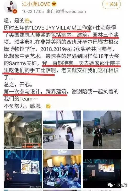 2019年,江一燕晒图称自己有建筑界的奖项,还有证书,让很多粉丝看后大呼不简单。