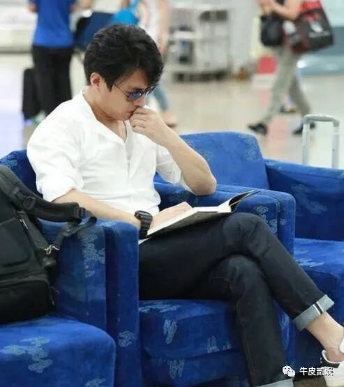 机场等飞机,靳东戴着墨镜,穿着白衬衣,一本正经地在看书,显得很爱学习。