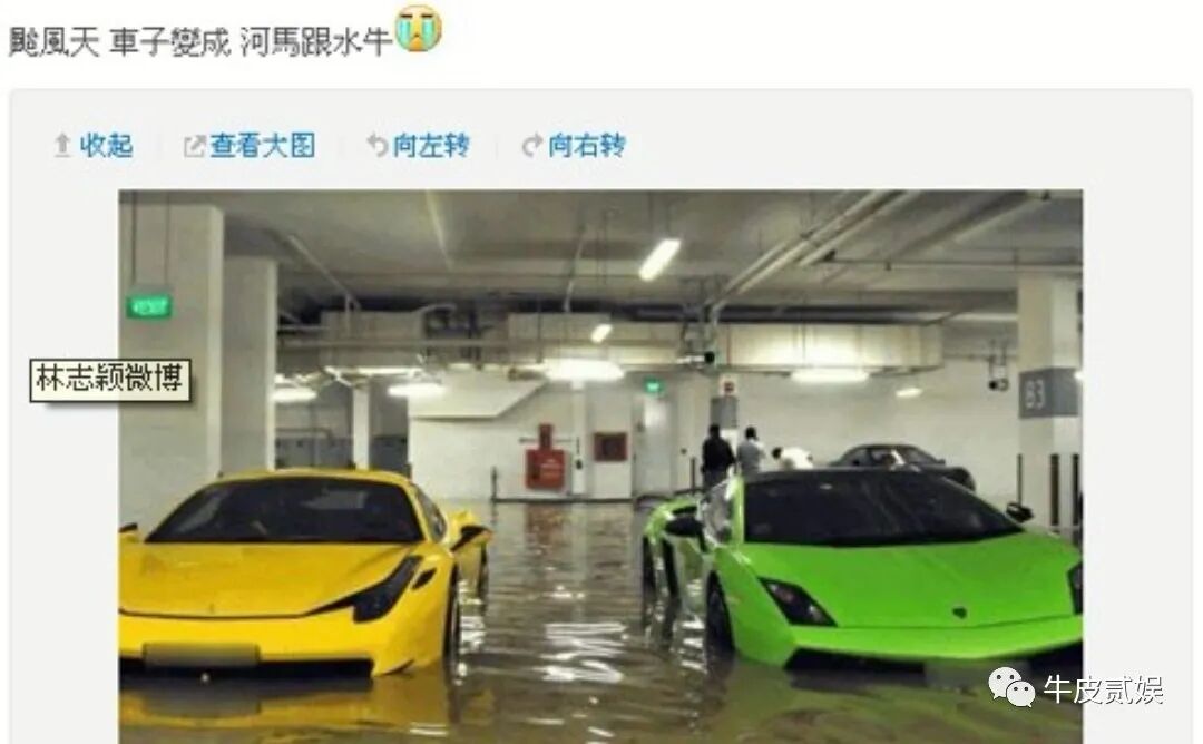 2012年,林志颖在自己的社交平台上发图称:台风天,车子变成了河马跟水牛。