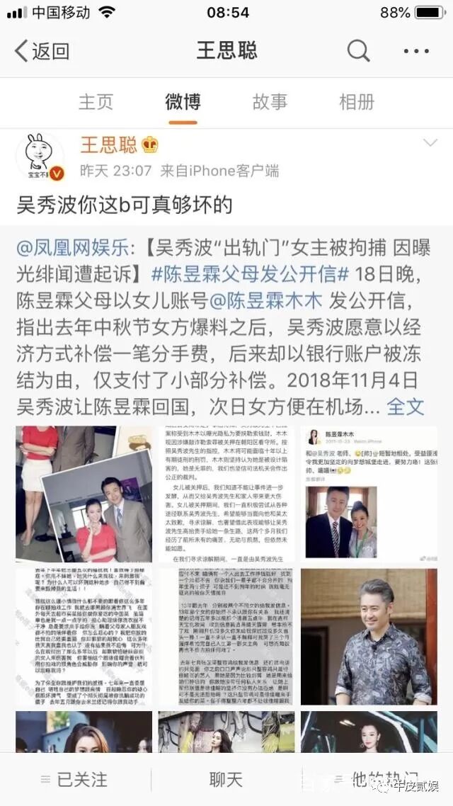 2019年,吴秀波被爆婚内出轨,女友陈昱霖在社交平台上发文称,她与吴秀波已经有7年的地下恋情了。