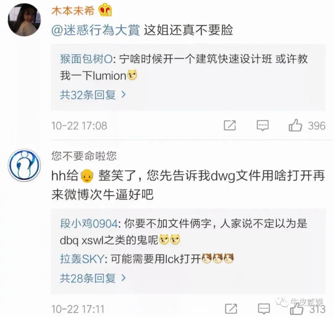 最终,狠狠地打脸了,有网友甚至嘲笑她说:“哈哈整笑了,您先告诉我dwg文件用啥打开再来微博吹牛好吧。”