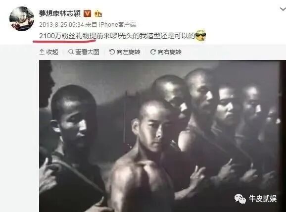 一年后,林志颖依然不吸取教训,如法炮制地又搞了一张这样的照片,只是这次是一张光头照,说是给2100万粉丝的礼物。