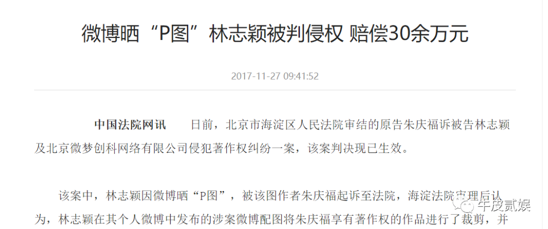 后来这事脑上了法庭,尽管林志颖态度很好,还百般辩解,但依然吃了败仗,并公开致歉,还赔偿了34.5万,算是吸取教训。