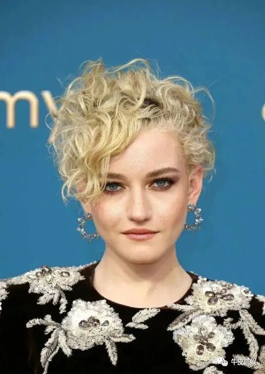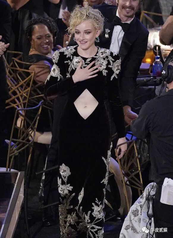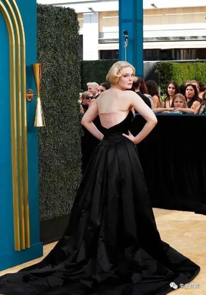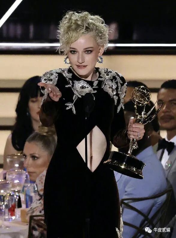 颁奖礼上,加纳依旧保留着自己剧中的金色卷发,只是她选择了一身类似于我们旗袍一样的礼裙。