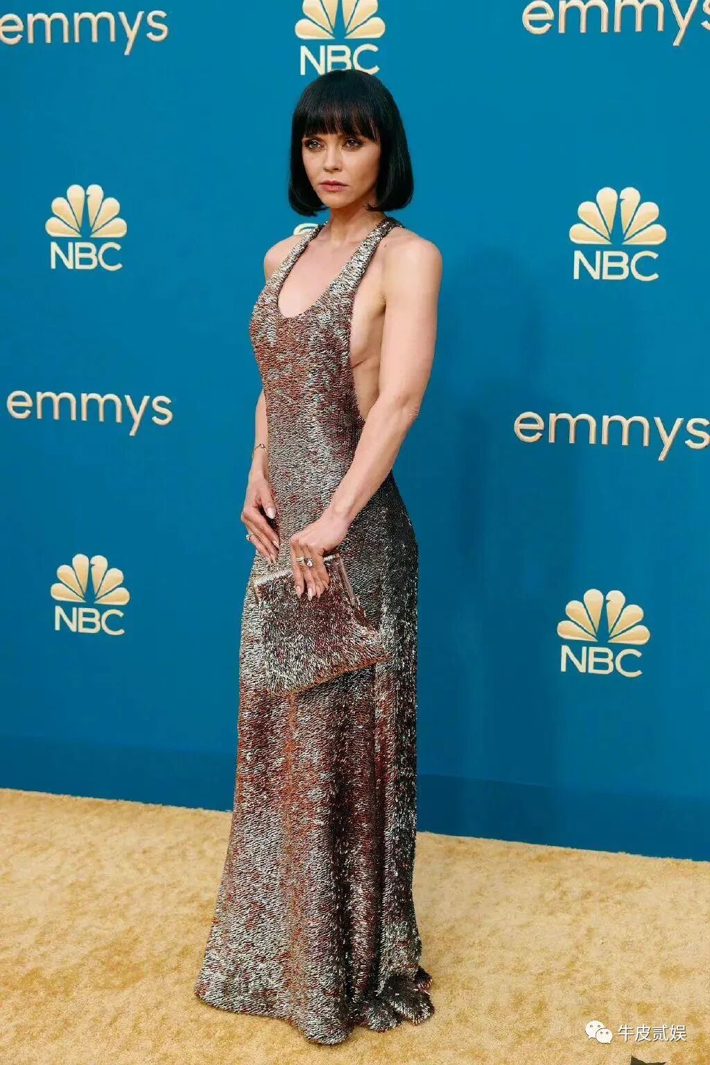 一头黑色的短发,一条棕色、黄色和卡其色混色的吊带亮片长裙,外加一个同色的包。