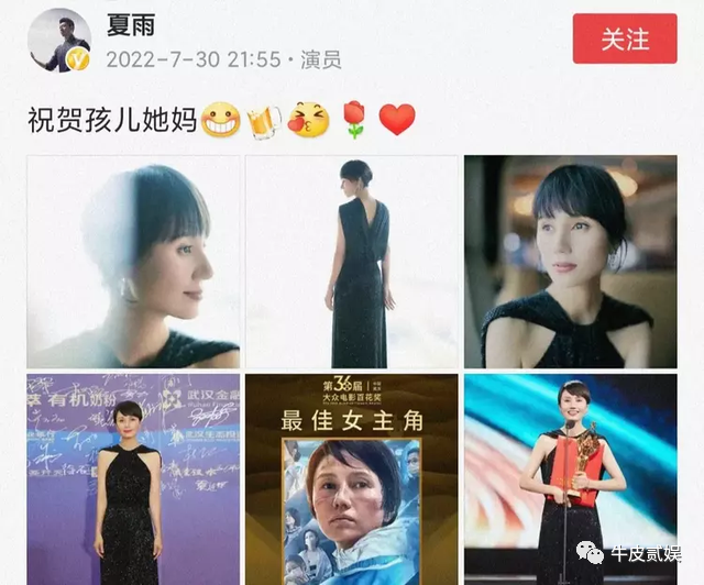 袁泉在事业上取得了新的成绩,夏雨也会在第一时间送上自己的祝福,比如今年袁泉得百花奖最佳女主,夏雨写道:祝贺孩儿她妈。